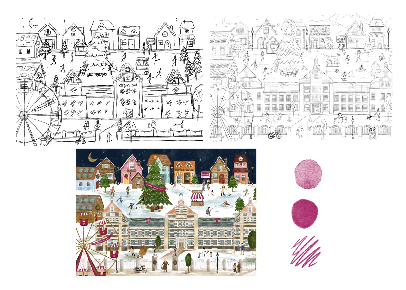 Één ontzettend leuke kennismakingcall én een briefing die mij meteen enthousiast maakte: ik mocht de kerstcampagne illustreren voor de Nederlandse hypotheekverstrekker uit het zuiden: voor Obvion! De ideeën van het marketingteam sloten perfect aan bij mijn illustratie werk. Er waren een paar musts aan de print: het karakteristieke pand waar ze gehuisvest zijn in Heerlen, het warme roze van Obvion, de huisstijlkleur en een aantal stillevens die natuurlijk met het merk te maken hebben. Daaromheen kon ik los gaan met mijn eigen ideeën voor het creëren van een gezellig, warm kerstdorp, waar vooral lekker veel leven in zat! Ik vond het natuurlijk fan-tas-tisch dat ze mij het vertrouwen gaven om hier een eigen invulling aan te geven.